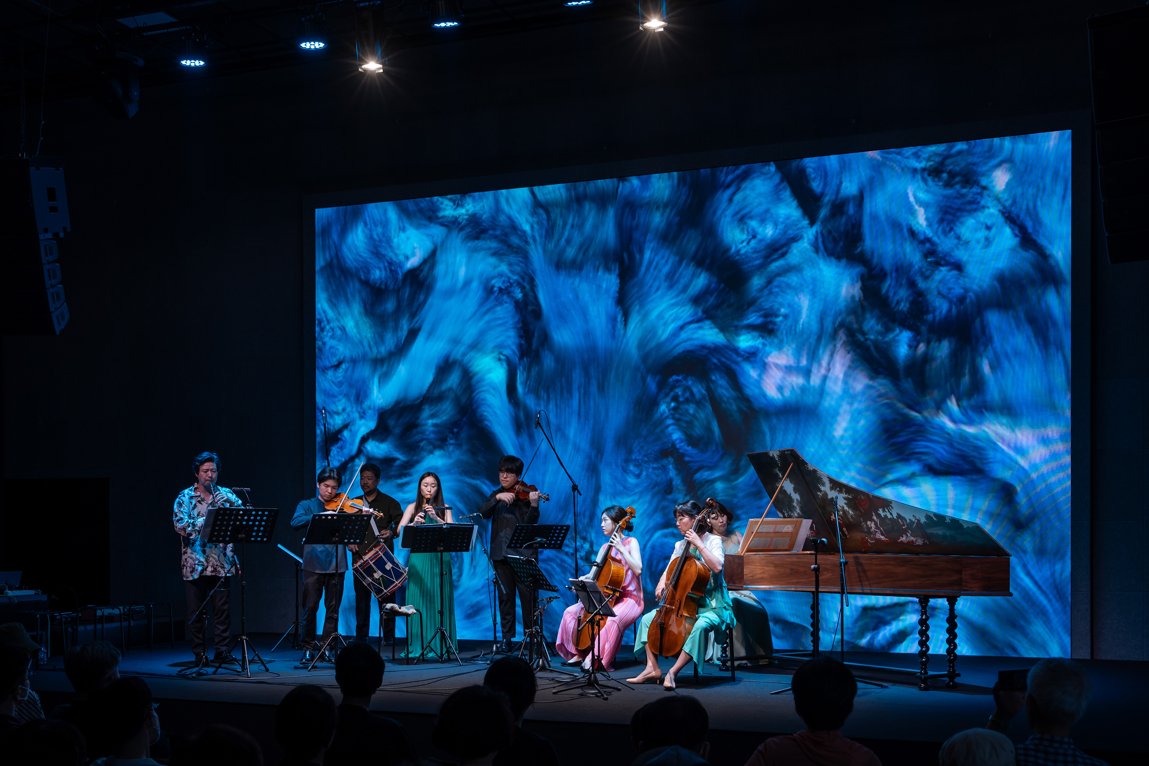 Inspired by the very essence of Baroque music, my artistic journey seamlessly intertwined the elegance of sound with the visual realm. Collaborating with Gut Cafe Seoul for the performance entitled "[French Baroque - Beauty Beyond, Elegance Within]," I crafted a real-time audio-visual masterpiece. Guided by the intrinsic traits of Baroque music, I harmonize its complexities with a graphic style. The performance resonated deeply, not solely through the auditory senses, but also through the mesmerizing visual symphony that encapsulated the very essence of Baroque aesthetics.