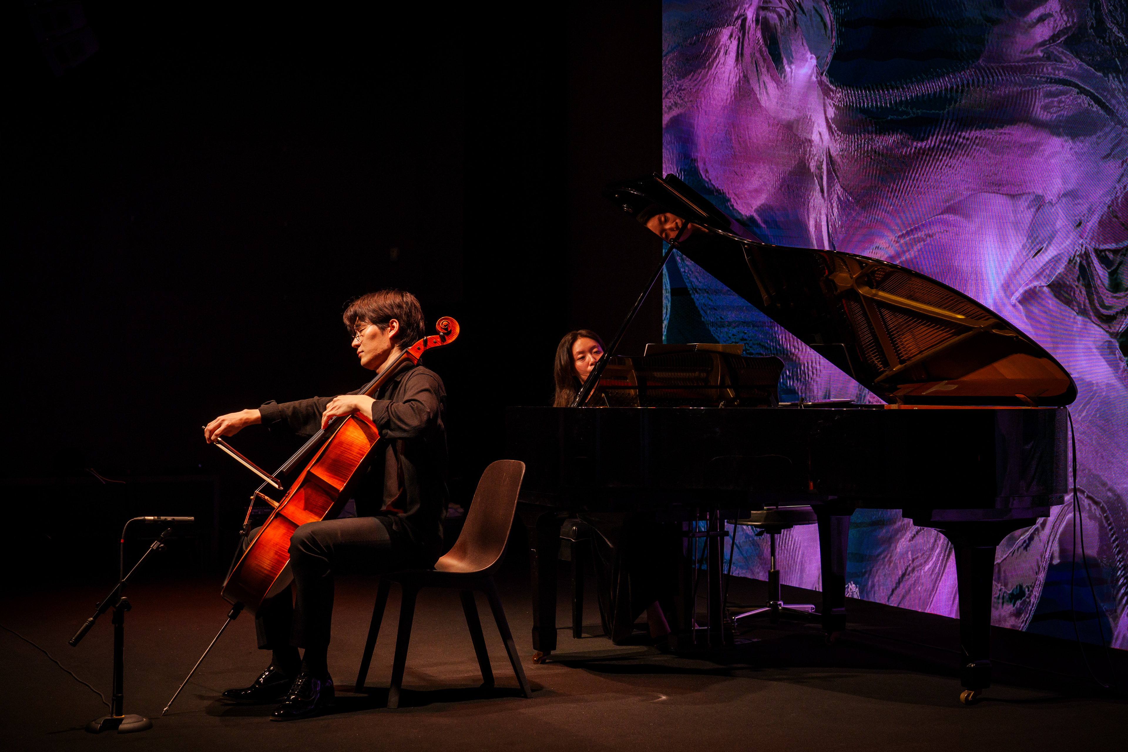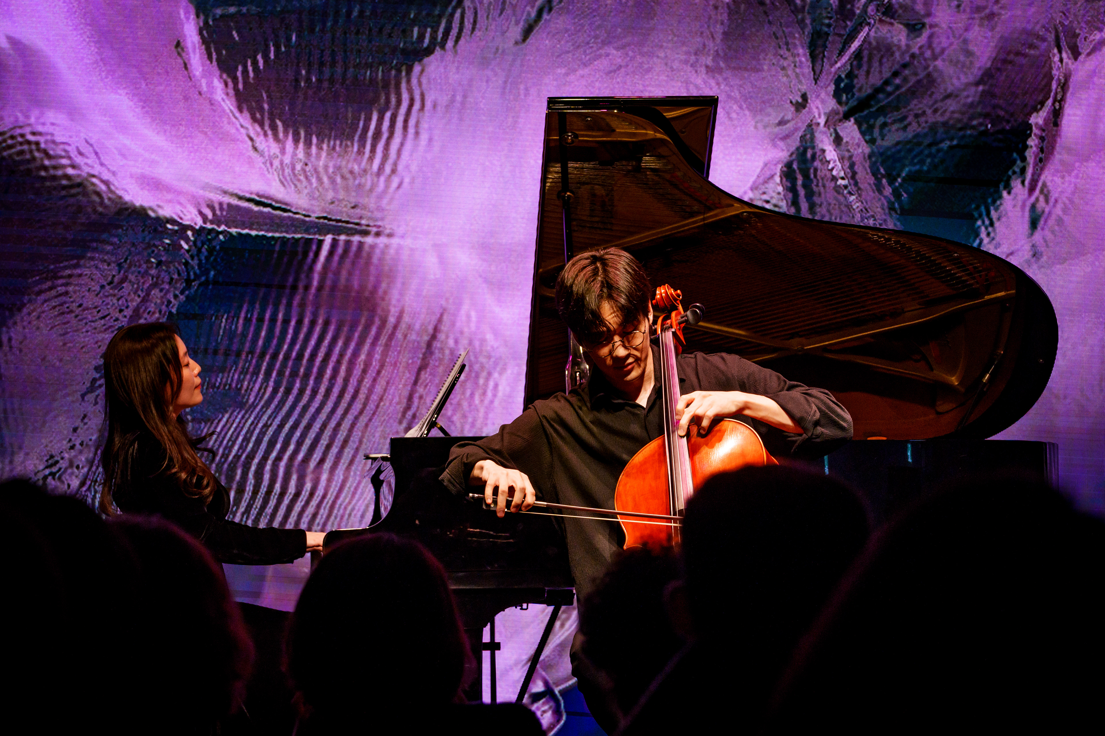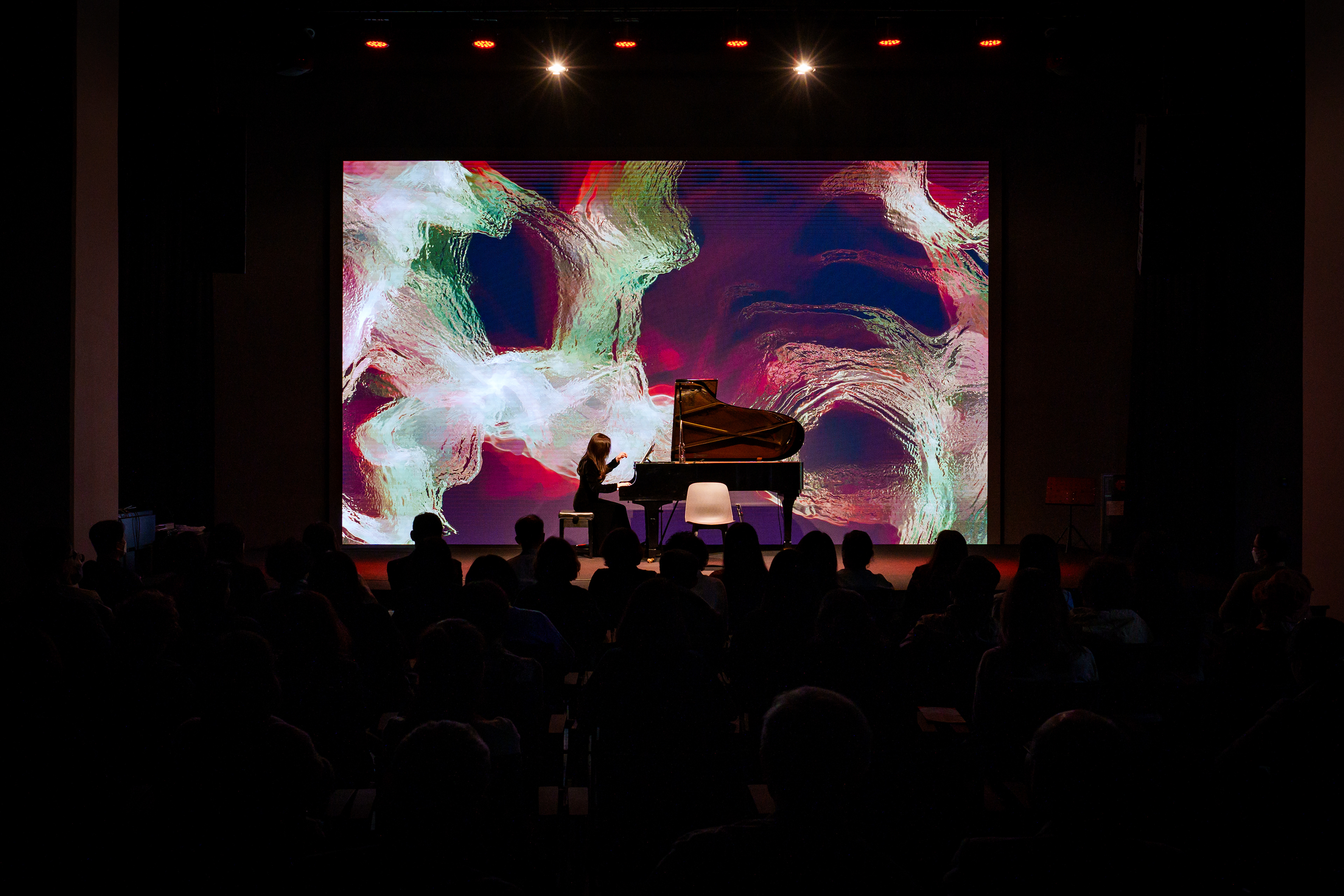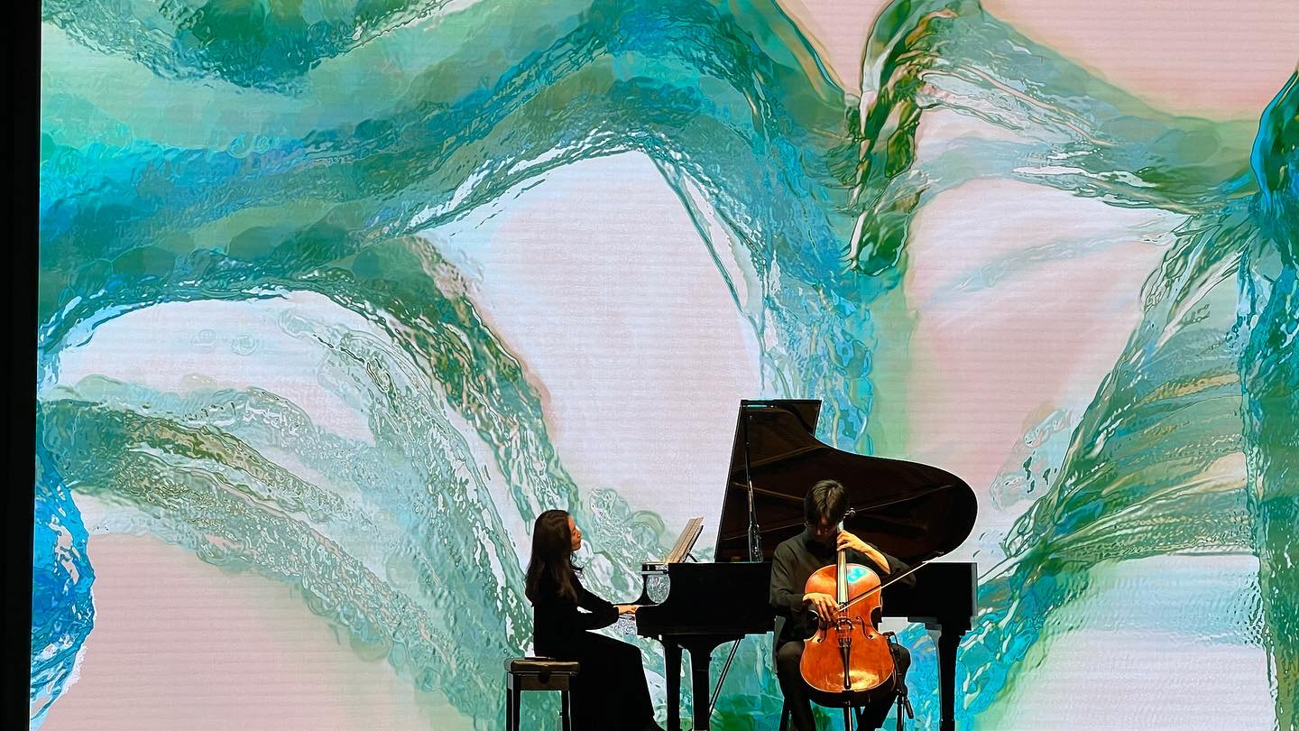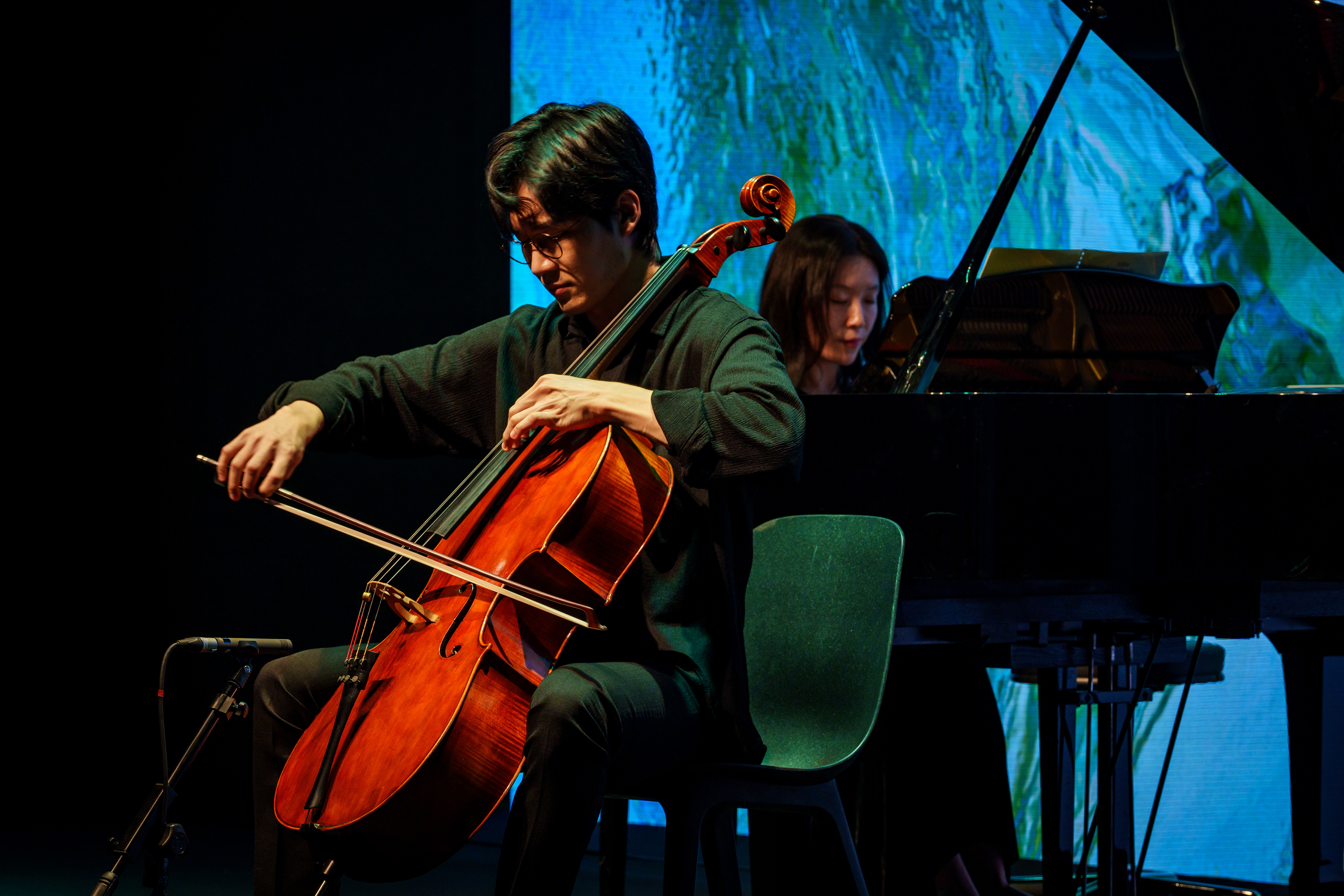 In the first week of October, I collaborated on a classical performance with cellist Park Geon-woo and pianist Choi Han-gyeol, integrating audio-visual elements. This concert featured romantic compositions by Schubert and Bach, perfect for the autumn ambiance. I crafted real-time graphics using the beautiful sounds they performed, embodying my identity as an artist who draws with sound.